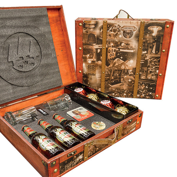 Continuando il viaggio nel mondo natalizio FORST, è possibile scoprire la preziosa valigetta natalizia che racchiude come un tesoro, al suo interno, tre bottigliette della Birra di Natale FORST con due calici dedicati, quattro palline di Natale, sottobicchieri retro in metallo, un accendino ed una spilla natalizia.