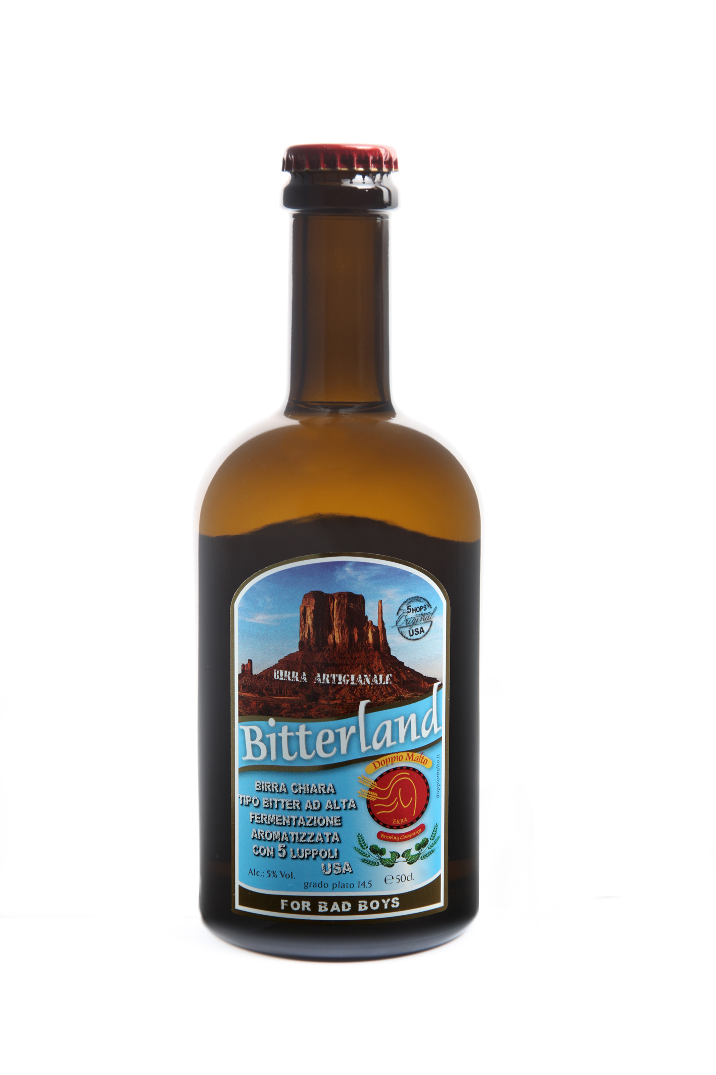 Birra dorata stile bitter, prodotta con cinque luppoli americani selezionati in due anni di viaggi negli U.S.A. del mastro birraio. Ha un profumo intenso e fresco, tra cui spicca su tutti l’agrumato; al palato ritroviamo l’intensa freschezza del bland di luppoli americani. Una birra secca e dissetante con note di amaro persistente.