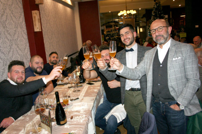Ben due i dessert, il primo un semifreddo dal nome che ne indicava la forma, Mezza sfera di nocciole e tartufo accompagnato da Melanie, la scura outmeal stout dagli aromi tostati di caffè e cacao che si alternano a sentori di vaniglia e nocciola, con un finale piacevolmente caramellato, il secondo un classico del centro Italia, Tozzetti della tradizione, cioè biscotti con miele, noci, mandorle o nocciole (a seconda delle zone) e pepe nero che hanno trovato la loro apoteosi con la Diva Gold, una strong ale di 8 gradi presentata in bottiglia da 75cl, una birra che vive una seconda fermentazione seguita da remuage e dégorgement e una successiva terza fermentazione con maturazione lenta e prolungata a temperatura costante, ideale per i dessert.
