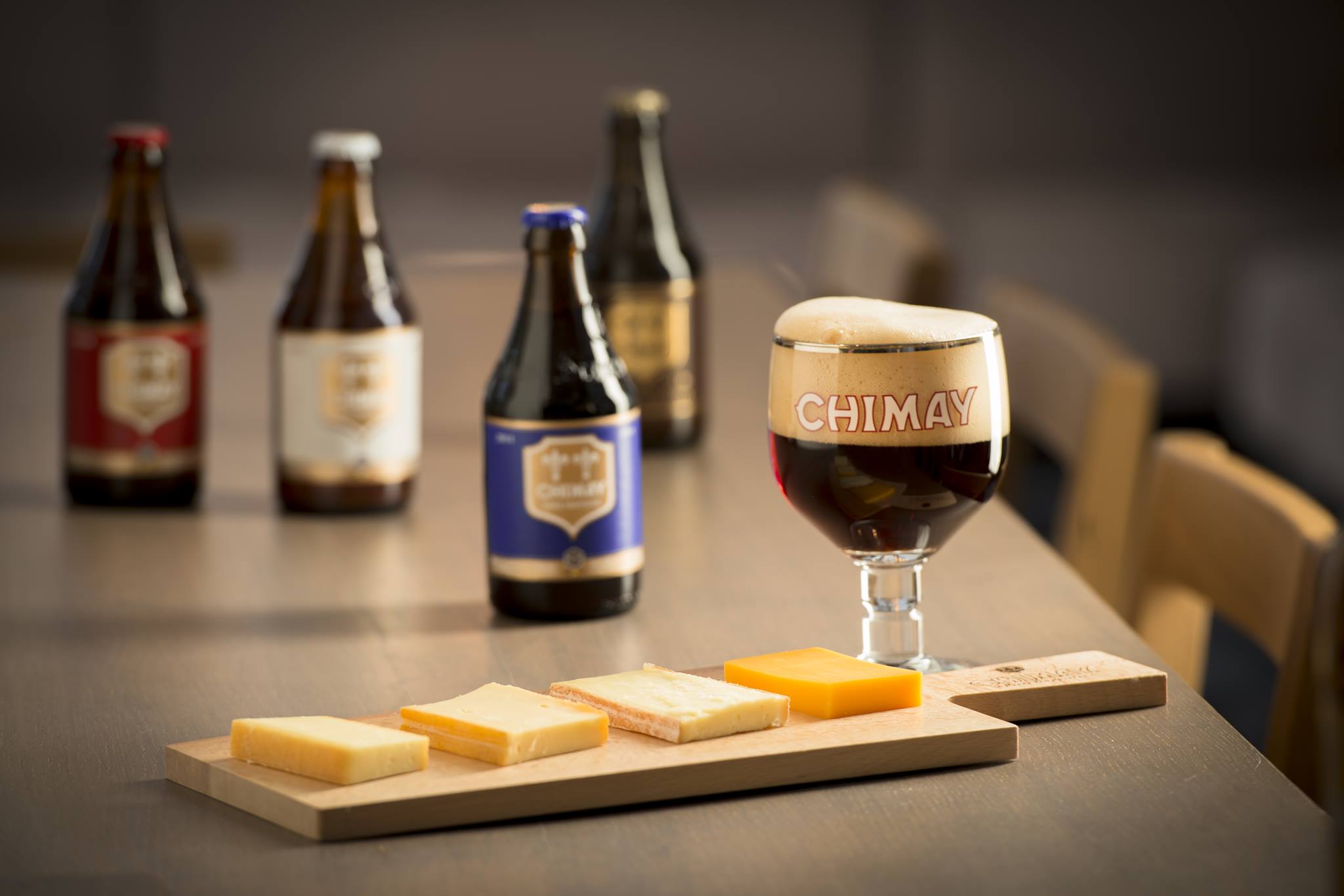 Chimay Blu o Grande Réserve, birra che si presta all’invecchiamento grazie alla positiva evoluzione dei suoi sapori e dei suoi profumi nel corso del tempo, con formaggio A La Blue o il cremoso Poteaupré, Chimay Rossa, conosciuta come la Première perché la sua ricetta è l’originale del 1862, la prima appunto, con formaggio A La Rouge, Chimay Bianca, Triple detta anche Cinq Cent, fresca e facile da bere grazie alla combinazione tra lievito e generosa luppolatura, con formaggio Vieux Chimay, Chimay Dorèe con formaggio Le Dorè.