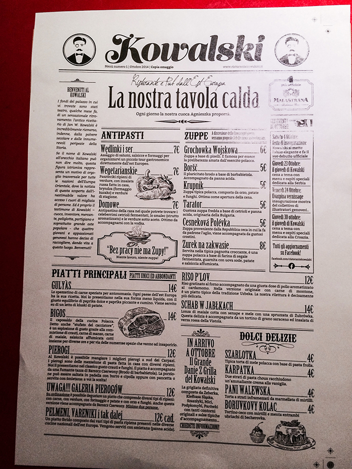 A pochi passi dal Duomo e dal Porto Antico, in via dei Giustiniani 3R, il ristorante pub Kowalski che propone cucina, cocktail e birre originali dell’Est Europa.