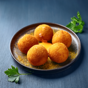 L’asterisco serve a non creare litigi fra sostenitori di arancini o arancine… per certo sono tra i simboli della Sicilia: fritti, croccanti all’esterno e ripieni di riso e di sugo. In India il riso si veste di curry, una miscela di spezie che varia da città a città. Dalle due tradizioni, nasce un sapore che sa di Mediterraneo e Asia: il curry al posto dello zafferano e magari un ripieno di verdure. Come se la nonna siciliana tornasse da un viaggio a Bombay con una nuova ricetta in tasca.