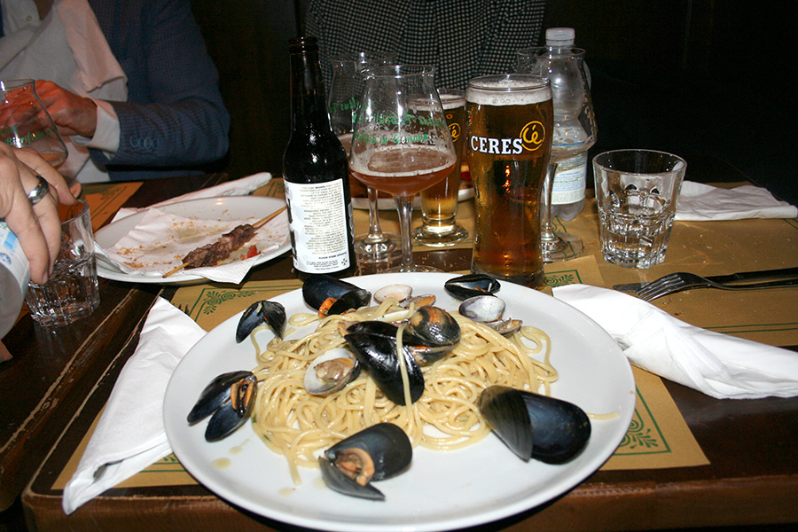 Il Molly Malone’s offre un servizio di ristorazione completa: oltre a fritti e hamburger, spiccano i piatti realizzati con la birra e, soprattutto, le pietanze a base di pesce, perché – ci spiega Enrico – la sua signora gestisce una pescheria. Ecco che tutte le Molly tornano al pettine…! E naturalmente si beve: Enrico ci racconta che fino a tre anni fa le birre irlandesi e inglesi erano praticamente le uniche scelte, ma oggi – accanto alle ovvie Guinness, Harp e Kilkenny – delle 10 vie di spillatura che dominano il bancone almeno un terzo è dedicato a birre artigianali e una spina accoglie le novità che periodicamente arrivano al Molly. Oltre alle artigianali è arrivata anche la Ceres, introdotta in modo a dir poco singolare: senza specificare quale birra fosse, è stata presentata semplicemente come una birra nordeuropea doppio malto per studiare la reazione dei frequentatori del locale. Da allora la Ceres è una certezza del pub: «È stato un vero successo! Sono passati più di due anni, e se ne consumano più fusti a settimana».