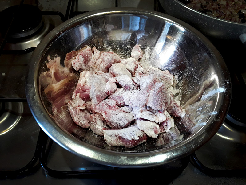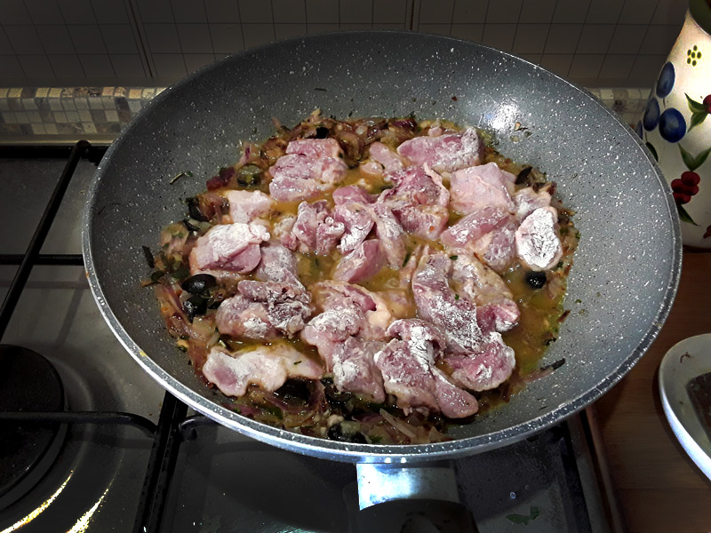 Quando il liquido si sarà ritirato è il momento di versare il tacchino infarinato, un pizzico di sale, pepe nero e, se volete, un pizzico di peperoncino. Alzate la fiamma e lasciate rosolare e insaporire la carne, aggiungete la birra rimanente (150cl) e lasciate andare a fuoco lento (è il momento di aggiungere un pugno di olive).