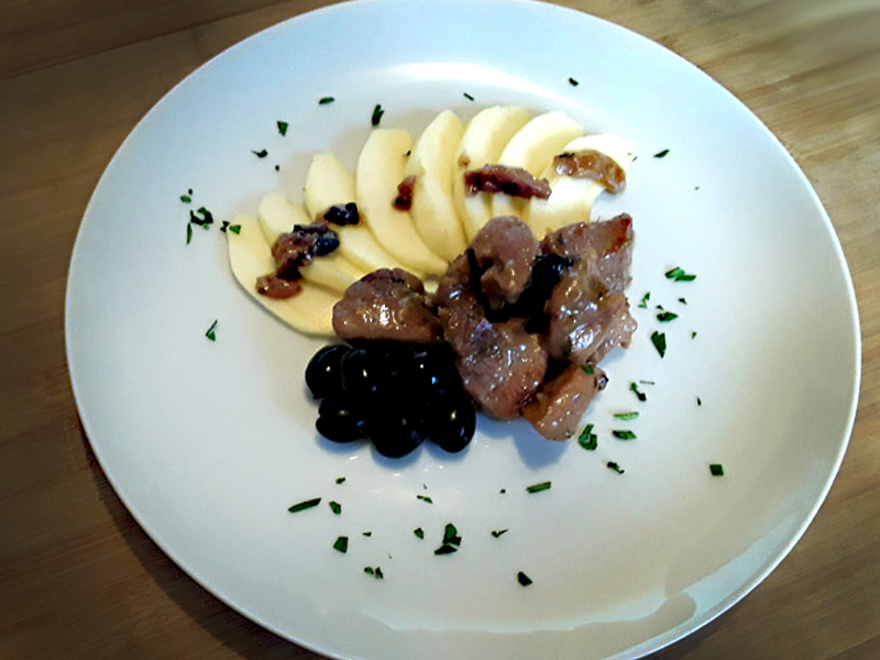 La cottura sarà ultimata dopo 15, max. 20 minuti (una cottura lunga e lenta renderà la carne più morbida e saporita). Accomodate nel piatto i bocconcini caldi, guarnite con olive e se volete con un ventaglio di spicchi di mela annurca per far godere un contrasto gradevole e sgrassante al palato.
